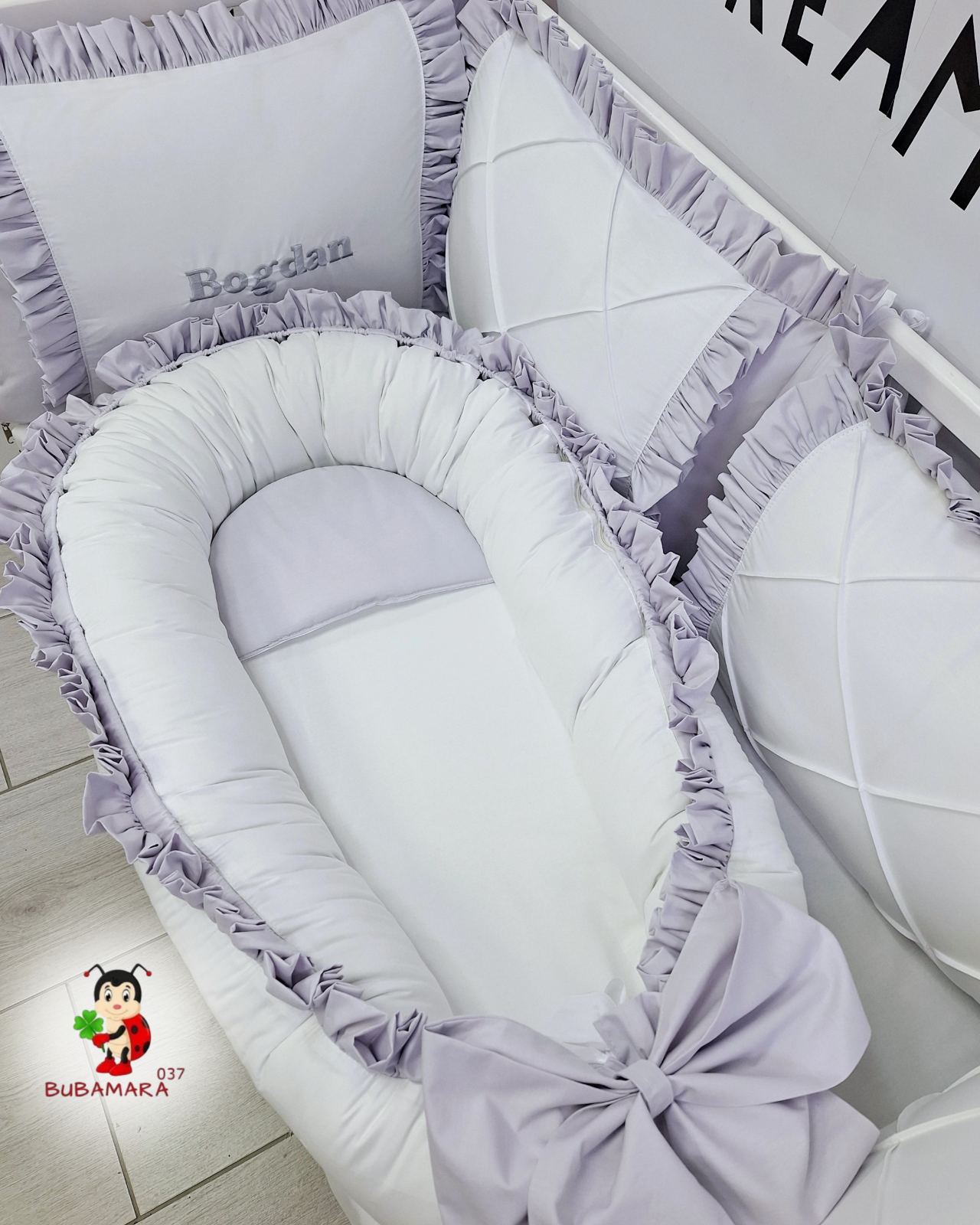 Gnezdo za bebe sa karnerom zlatne tufne, lavanda Распон цена: од 4.590,00 рсд до 4.890,00 рсд