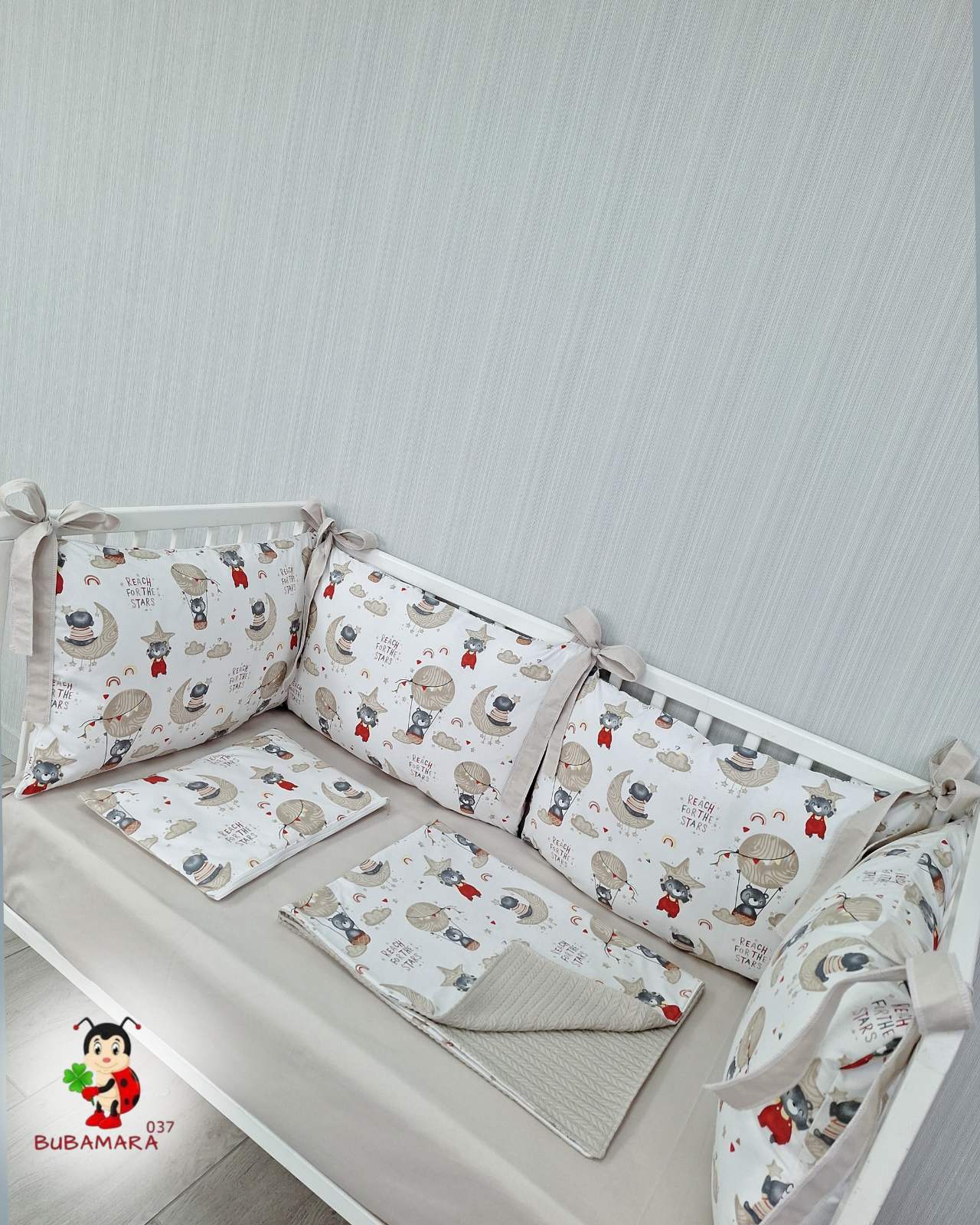 Set za krevetac sa ogradicom od jastuka odgovara dimenzijama kreveca 120 x 60 cm i sadrži sledeće: