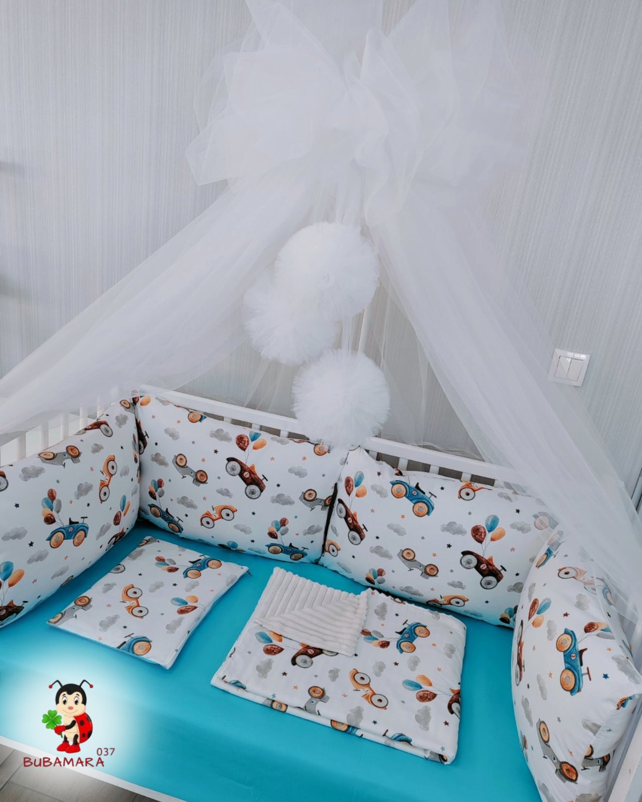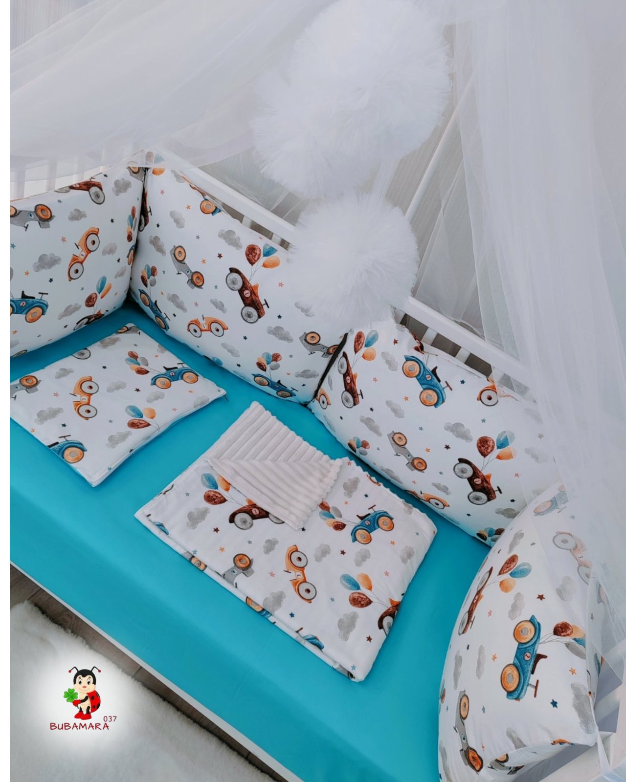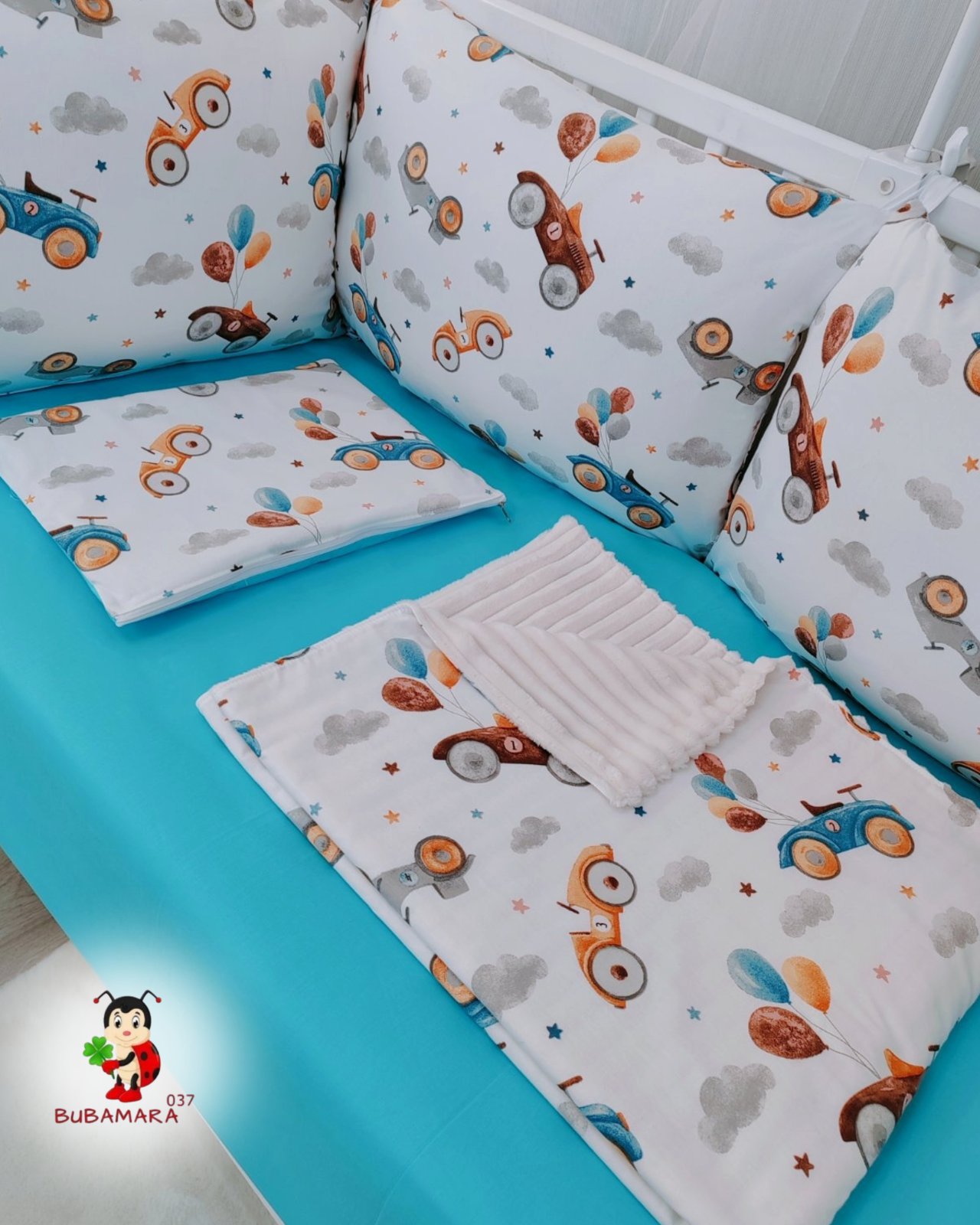 Set za krevetac sa ogradicom od jastuka „Retro autići“