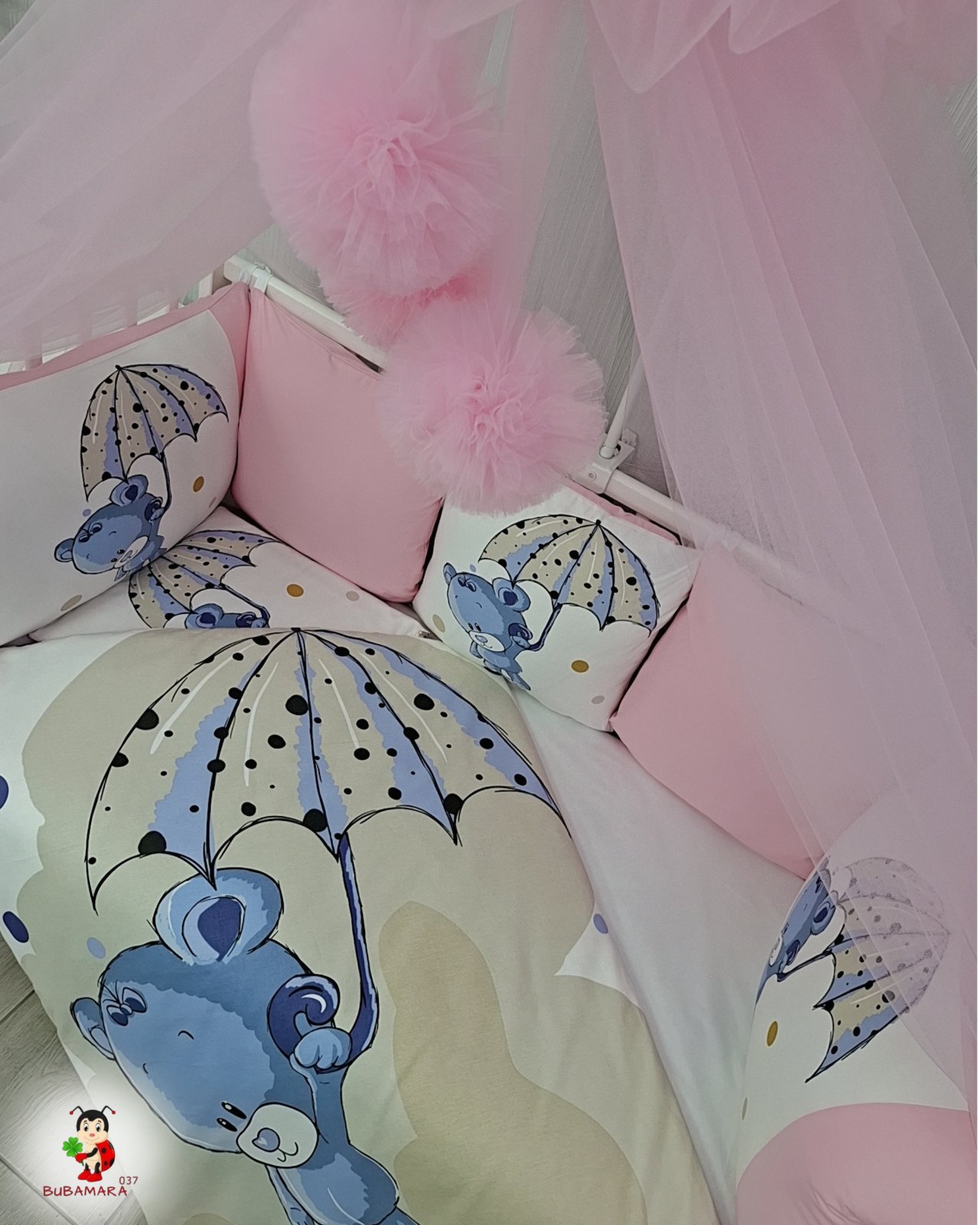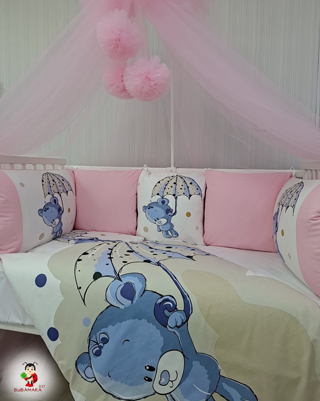 Set za krevetac sa ogradicom od jastuka za blizance “Meda s kišobranom“