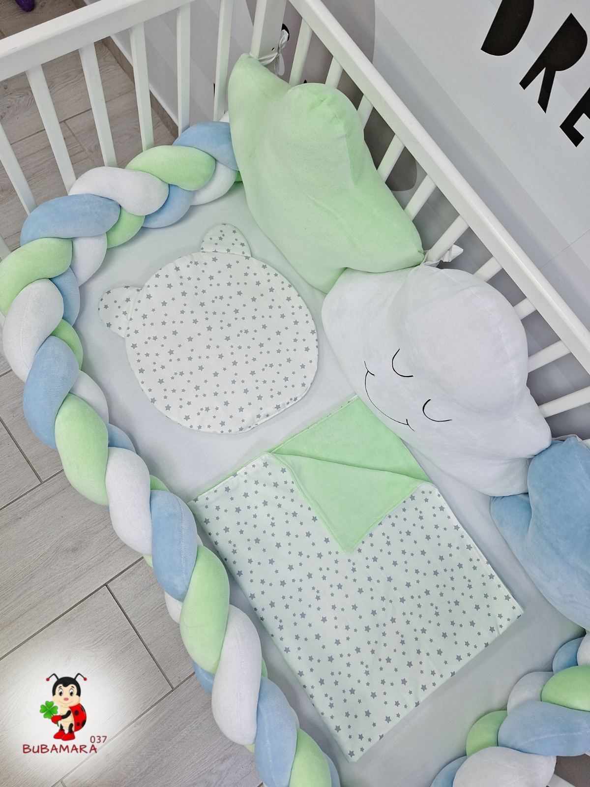 Set za krevetac sa ogradicom od pletenica odgovara dimenzijama kreveca 120 x 60 cm i sadrži sledeće: