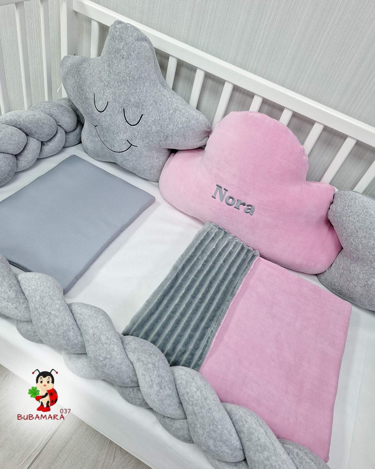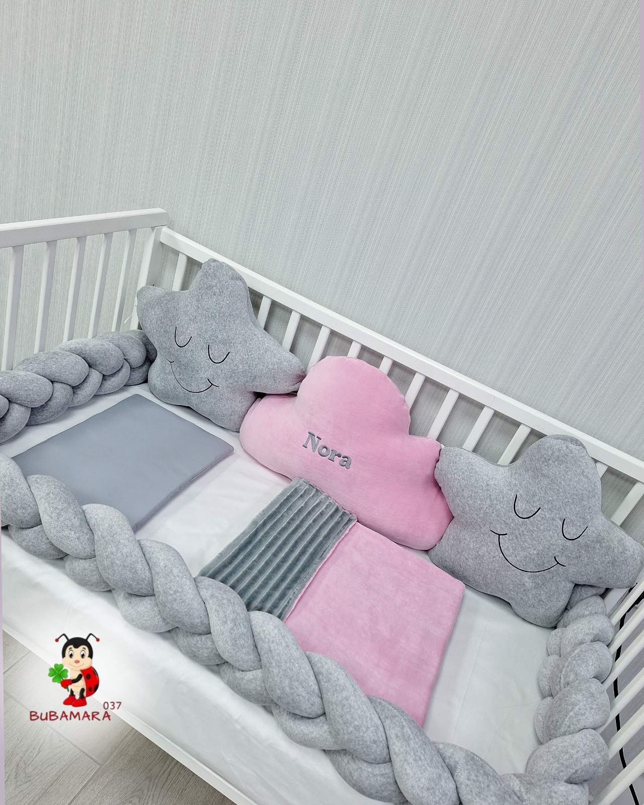 Set za krevetac sa ogradicom od pletenica odgovara dimenzijama kreveca 120 x 60 cm i sadrži sledeće: