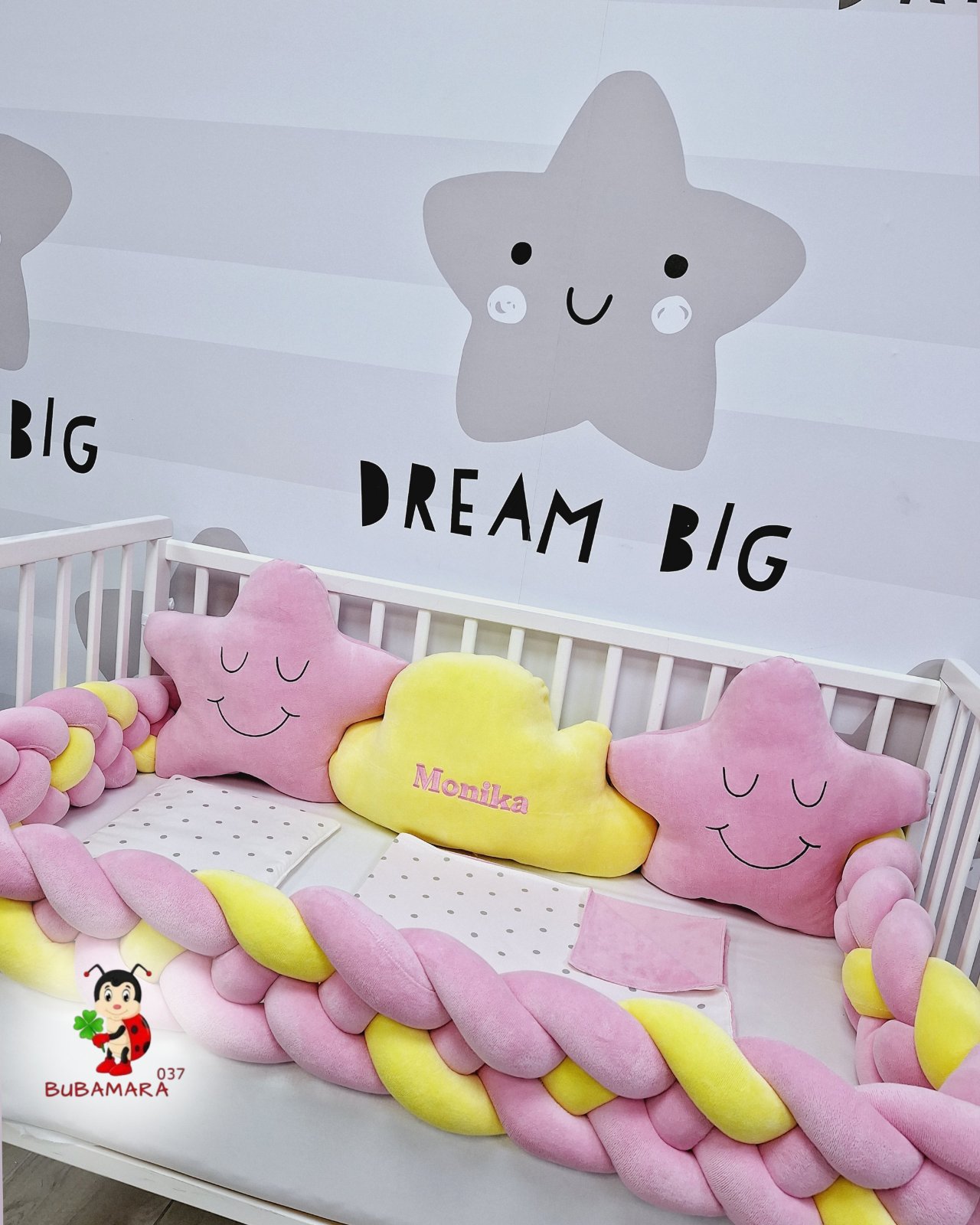 Set za krevetac sa ogradicom od pletenica odgovara dimenzijama kreveca 120 x 60 cm i sadrži sledeće: