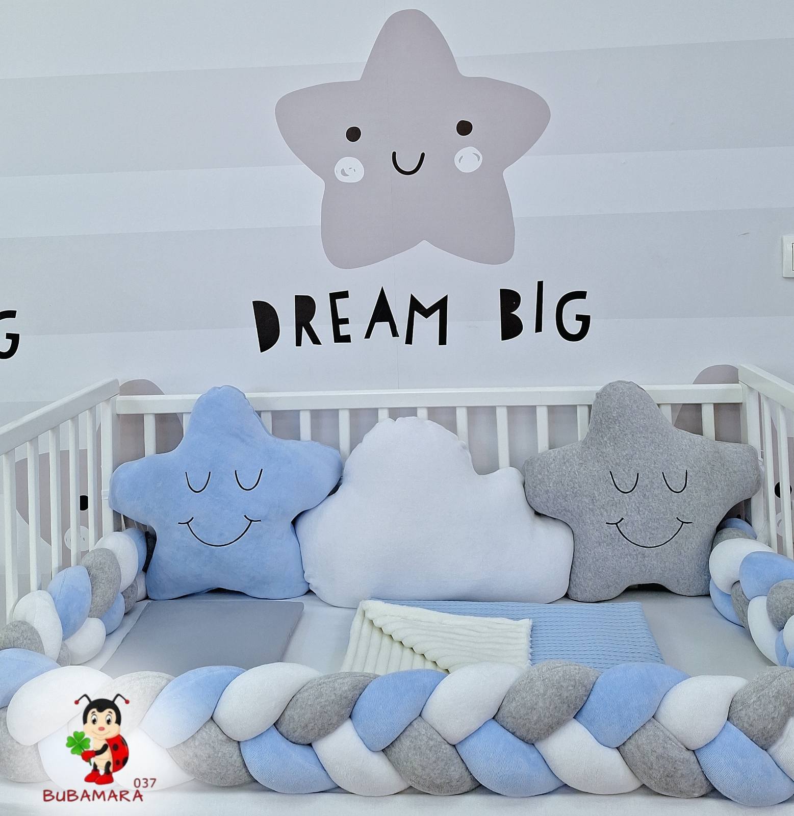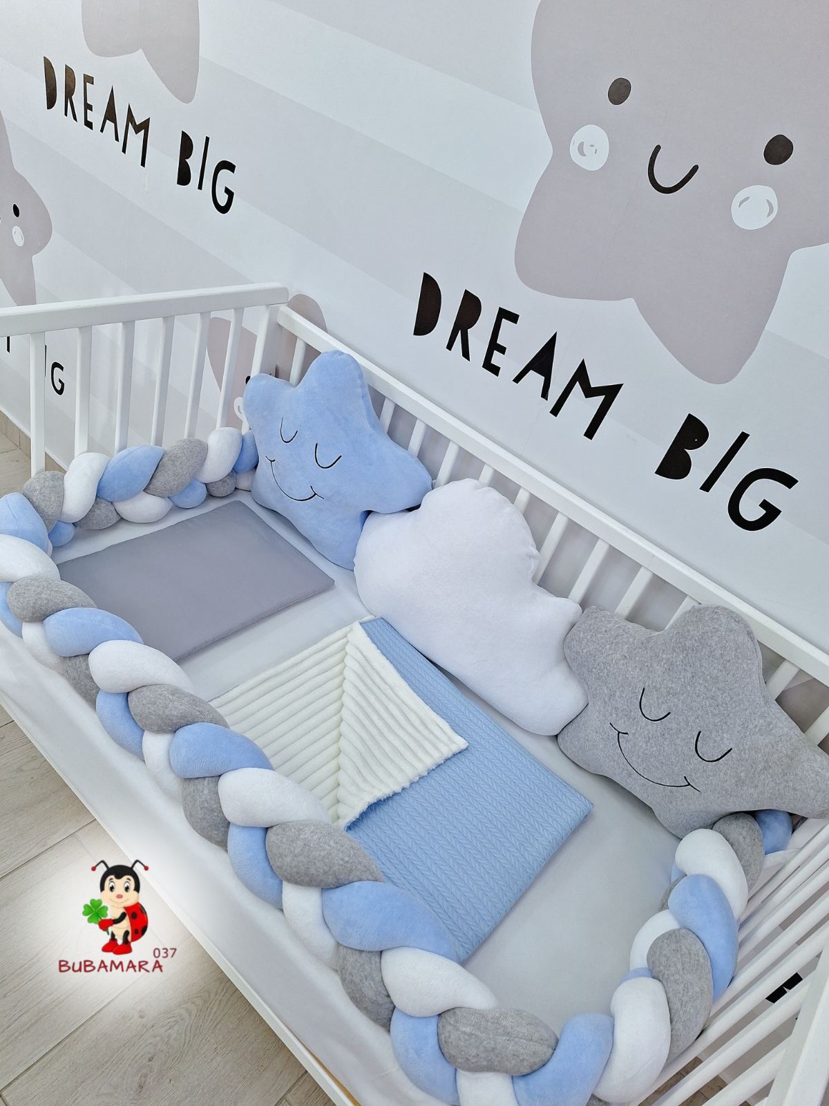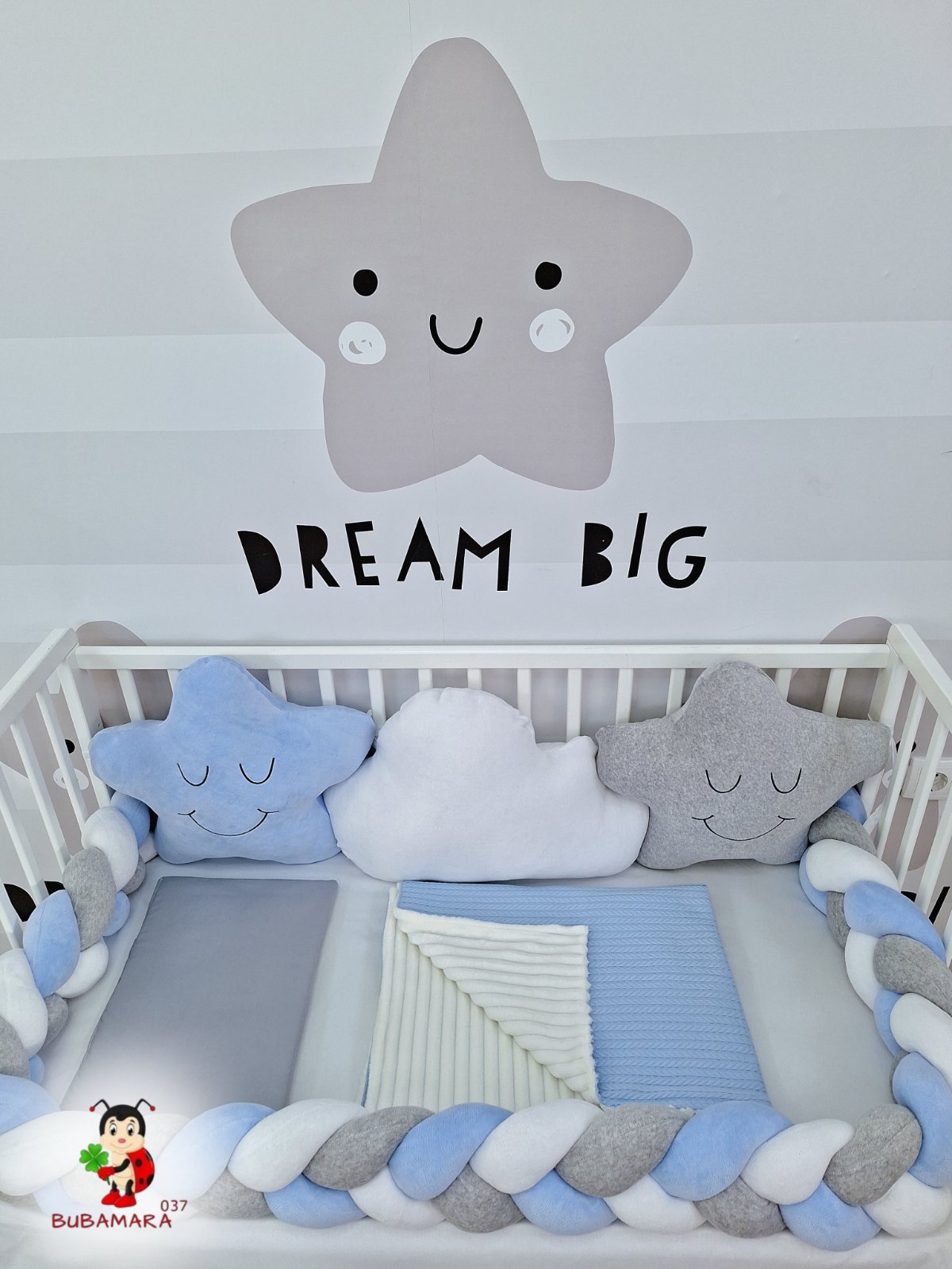 Set za krevetac sa ogradicom od pletenica odgovara dimenzijama kreveca 120 x 60 cm i sadrži sledeće:
