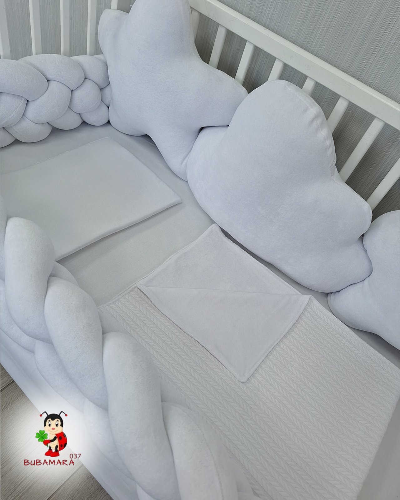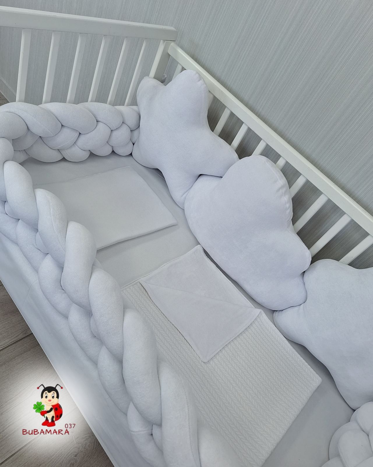 Set za krevetac sa ogradicom od pletenica odgovara dimenzijama kreveca 120 x 60 cm i sadrži sledeće: