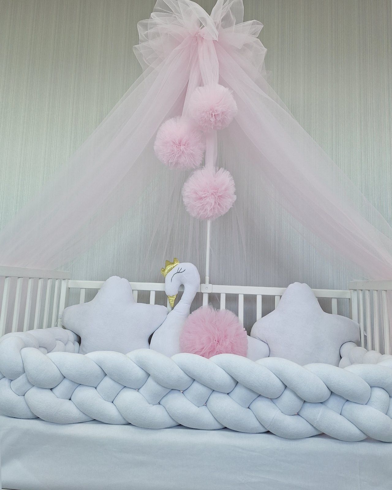 Set za krevetac sa ogradicom od pletenica odgovara dimenzijama kreveca 120 x 60 cm i sadrži sledeće: