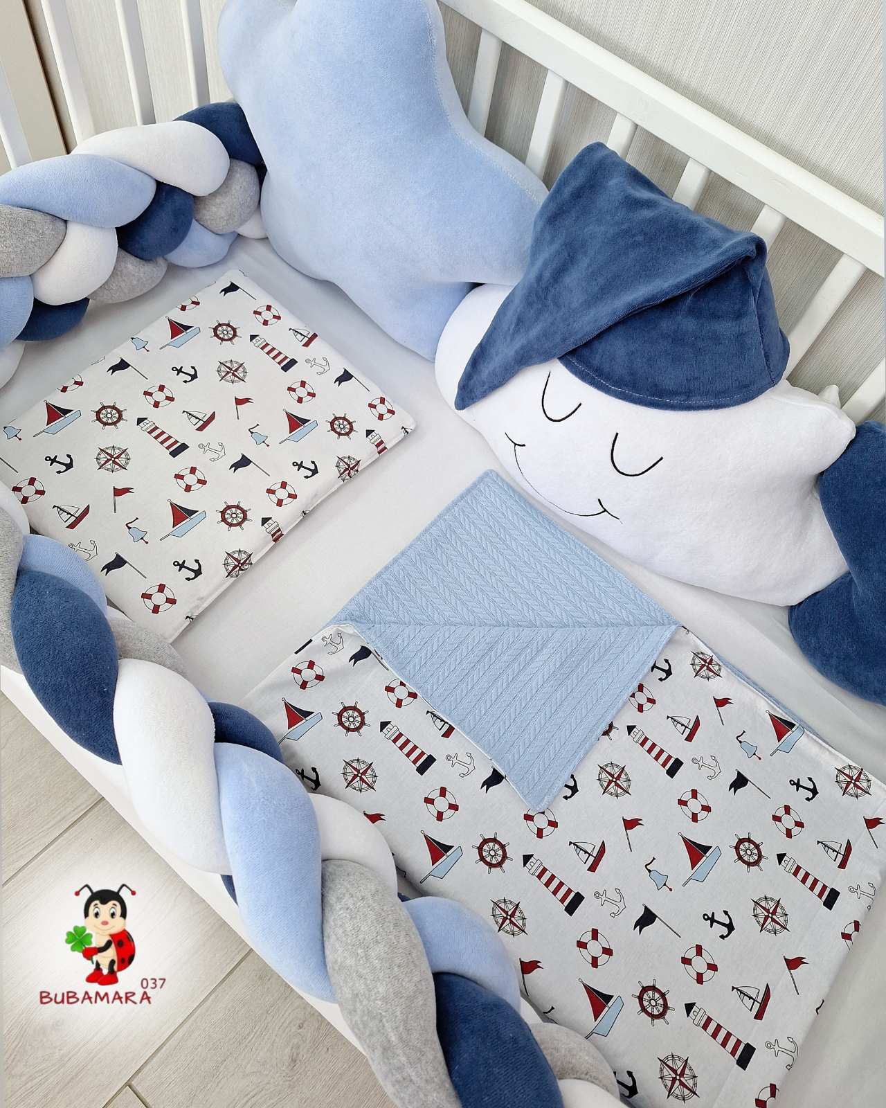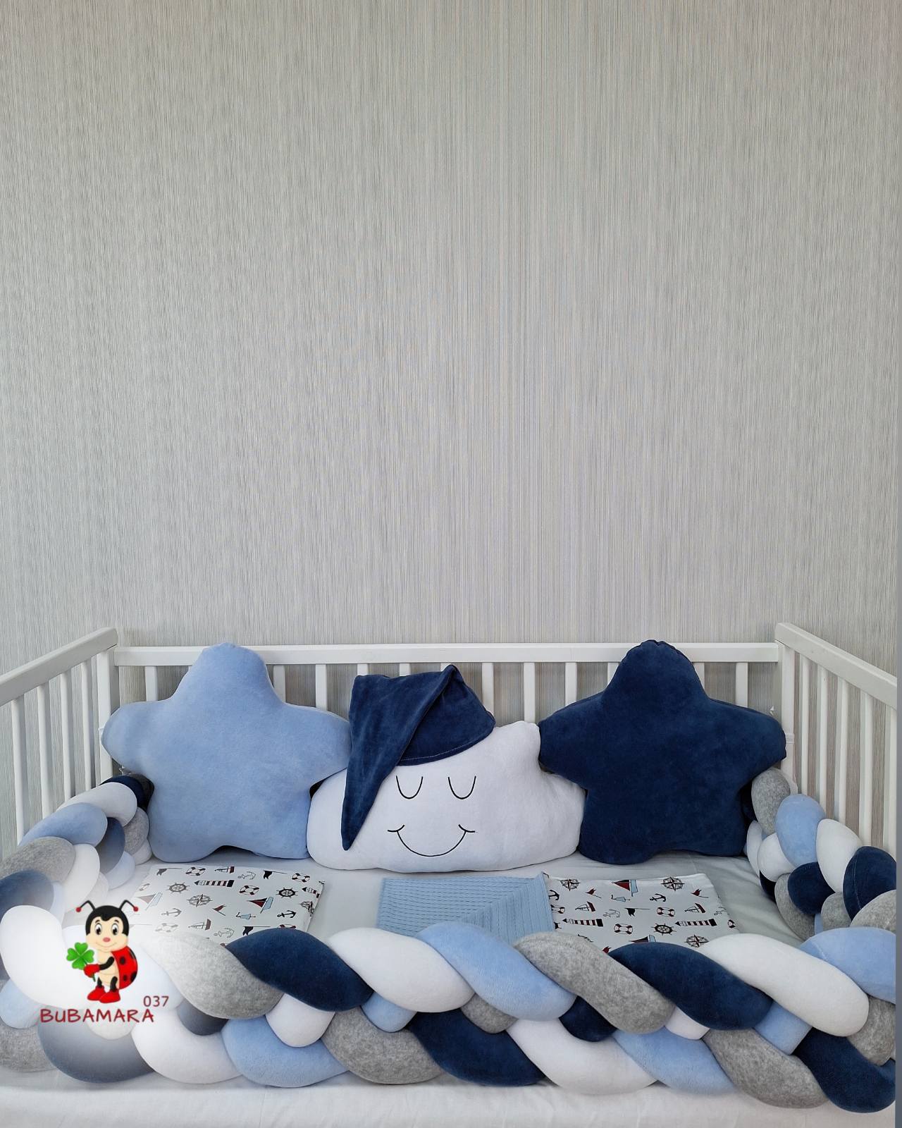 Set za krevetac sa ogradicom od pletenica odgovara dimenzijama kreveca 120 x 60 cm i sadrži sledeće: