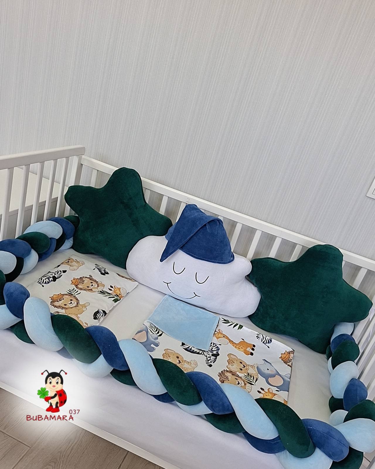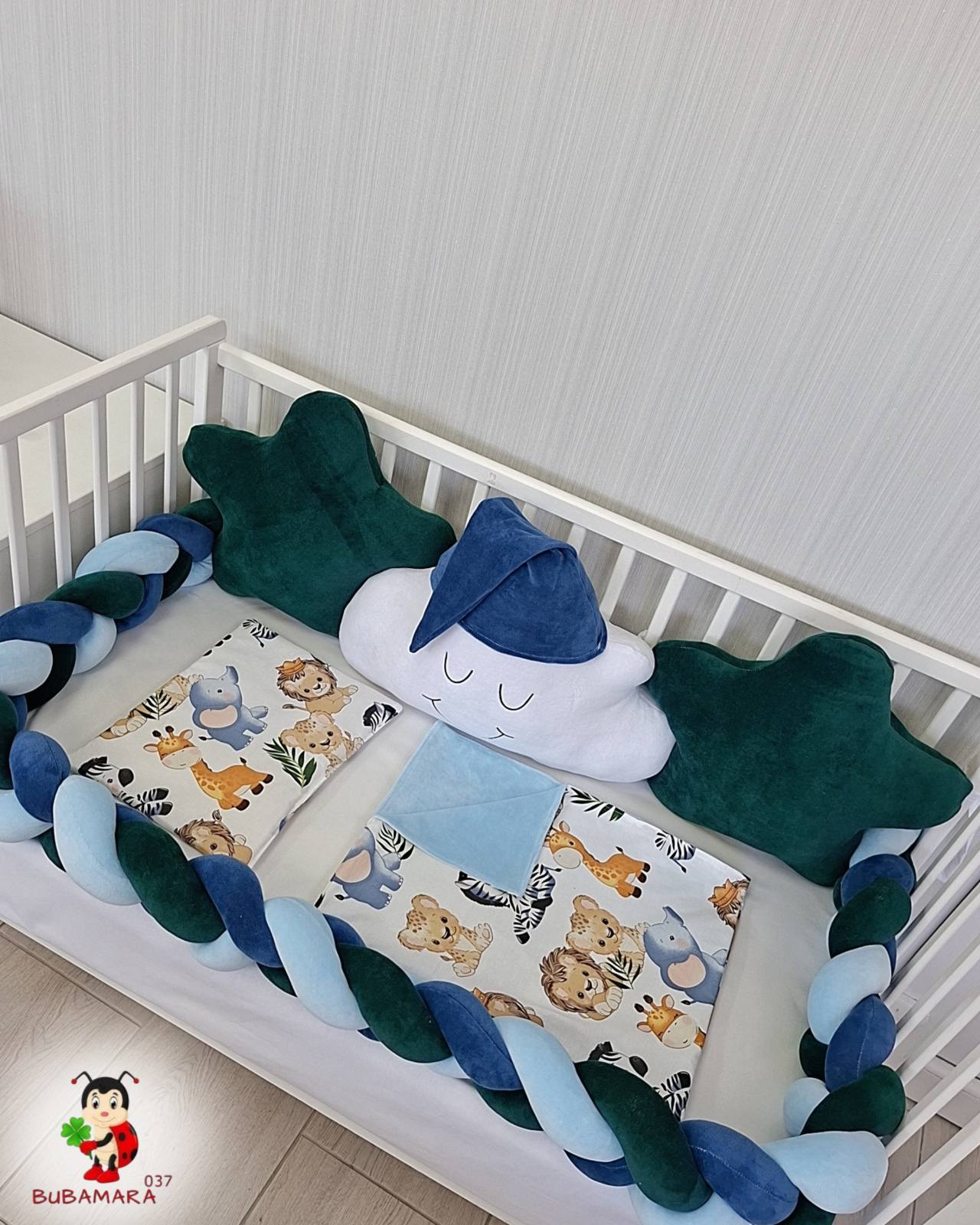 Set za krevetac sa ogradicom od pletenica odgovara dimenzijama kreveca 120 x 60 cm i sadrži sledeće: