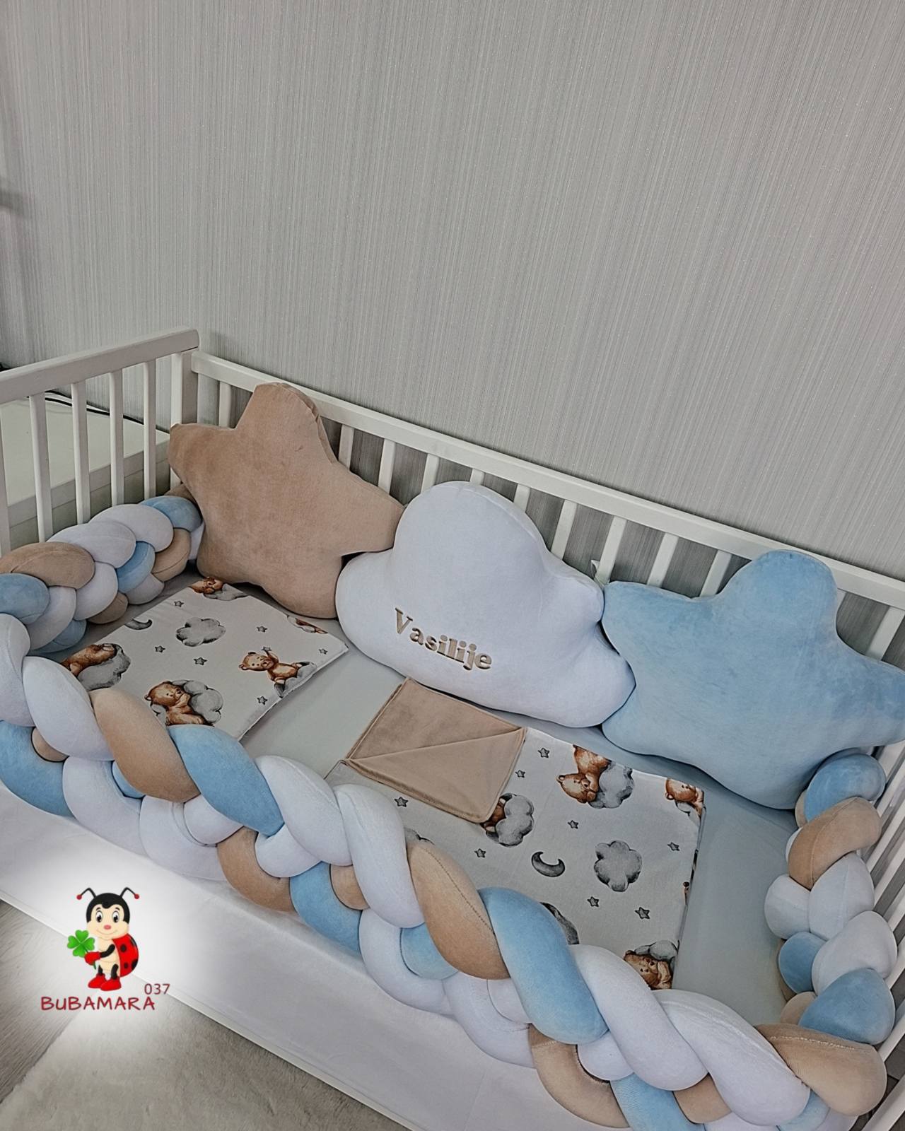 Set za krevetac sa ogradicom od pletenica odgovara dimenzijama kreveca 120 x 60 cm i sadrži sledeće: