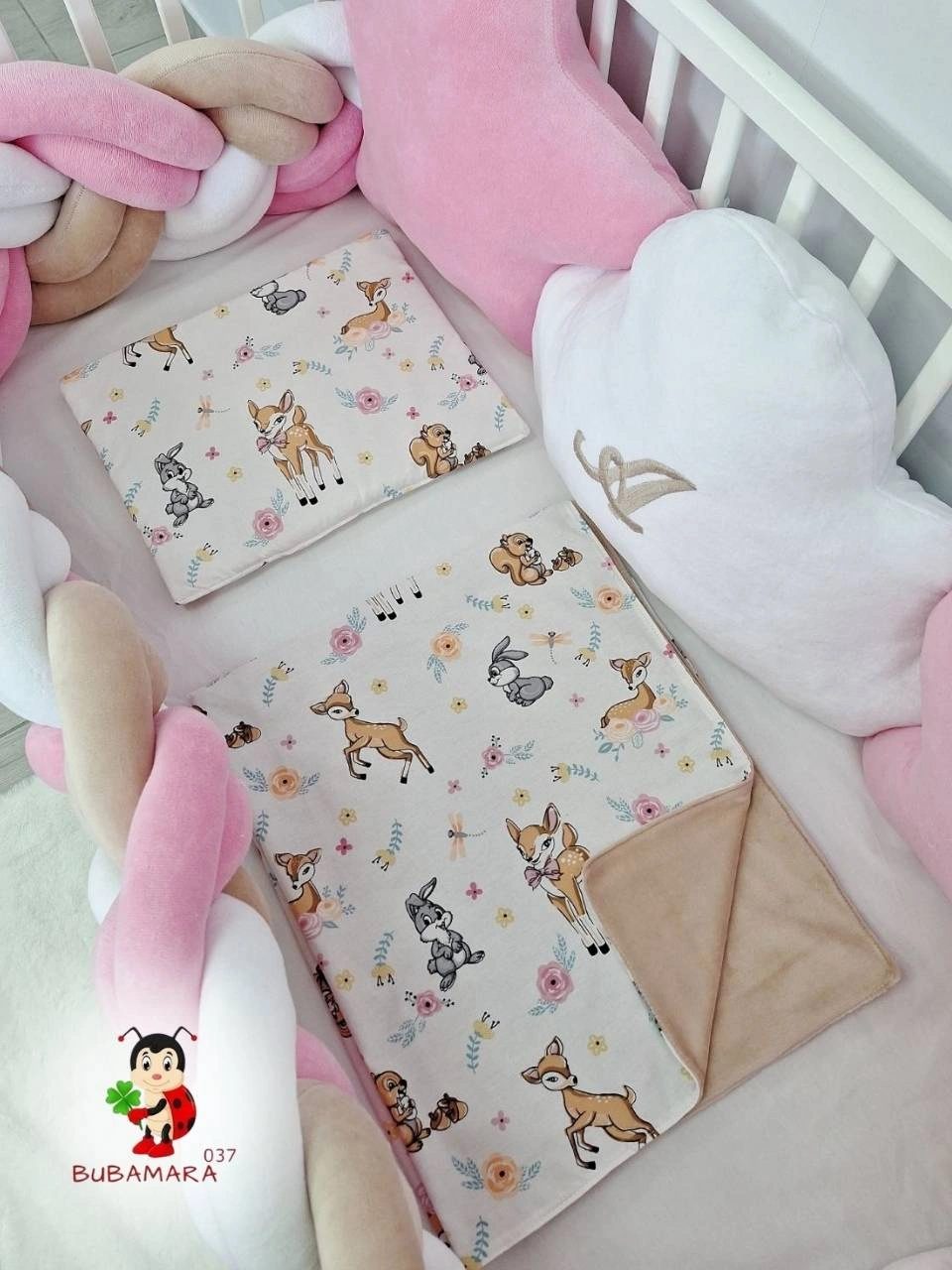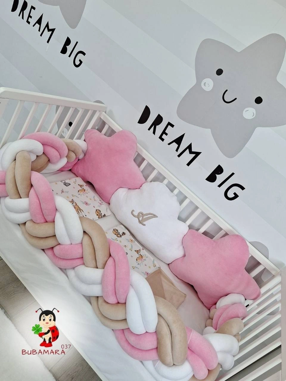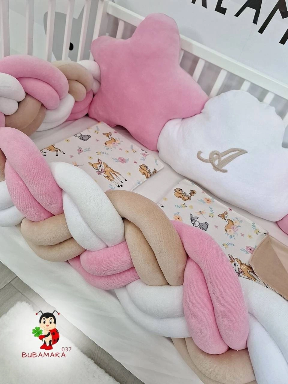 Set za krevetac sa ogradicom od pletenica odgovara dimenzijama kreveca 120 x 60 cm i sadrži sledeće:
