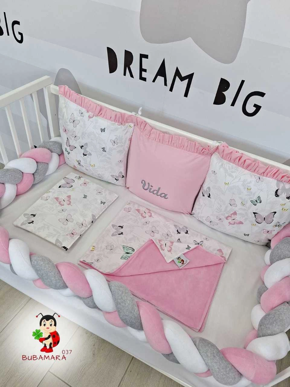 Set za krevetac sa ogradicom od pletenica odgovara dimenzijama kreveca 120 x 60 cm i sadrži sledeće:
