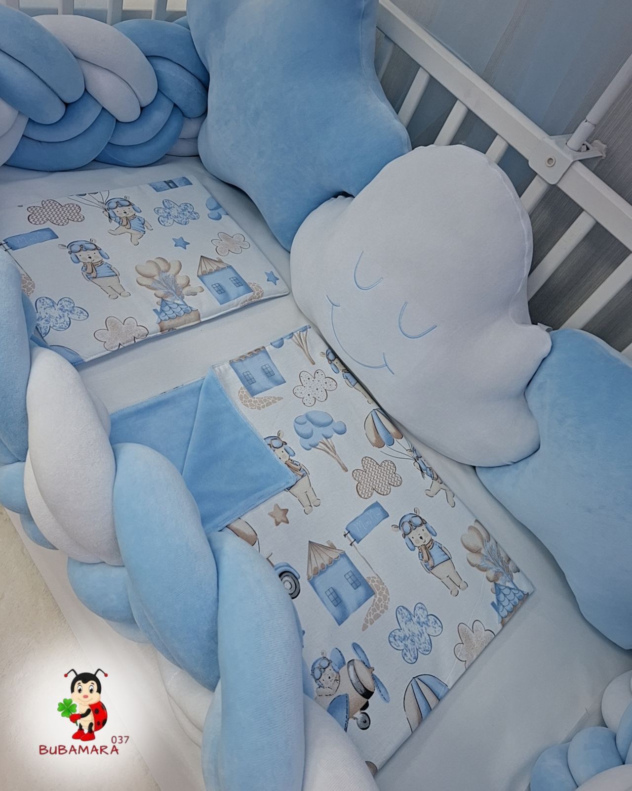 Set za krevetac sa ogradicom od pletenica odgovara dimenzijama kreveca 120 x 60 cm i sadrži sledeće:
