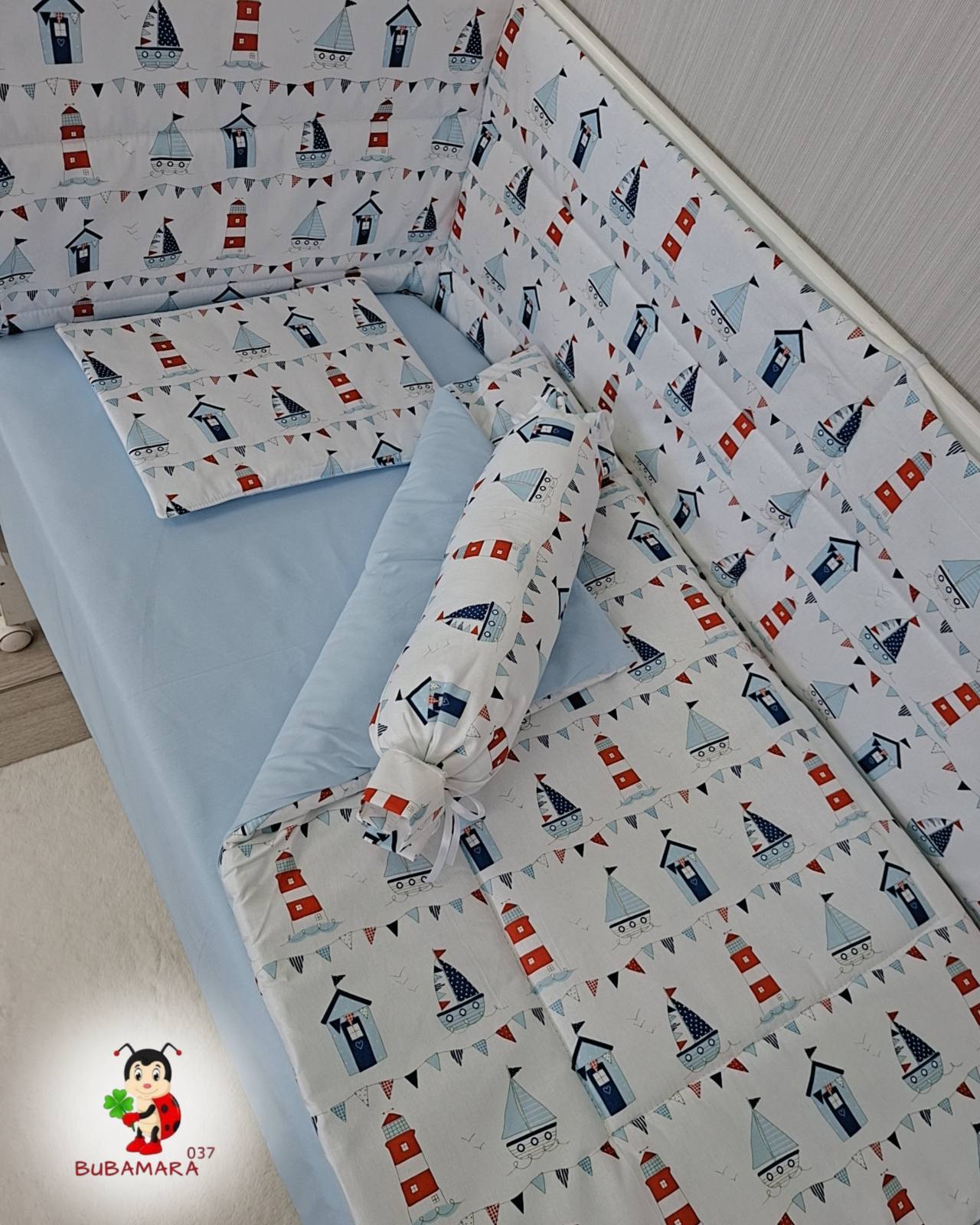Set za krevetac sa ravnom ogradicom mornarska , bebi plava