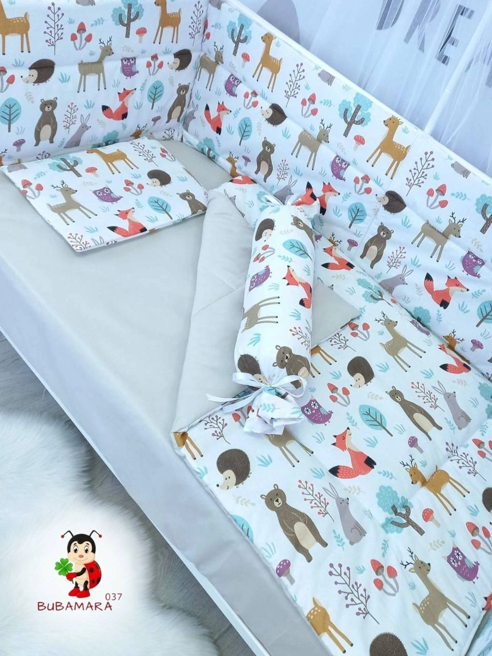 Set za krevetac sa ravnom ogradicom odgovara dimenzijama kreveca 120 x 60 cm i sadrži sledeće: