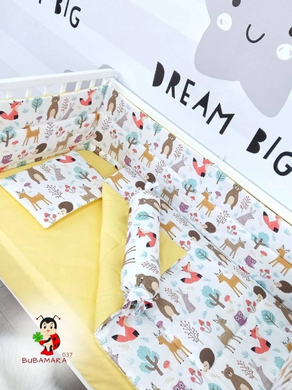 Set za krevetac sa ravnom ogradicom odgovara dimenzijama kreveca 120 x 60 cm i sadrži sledeće: